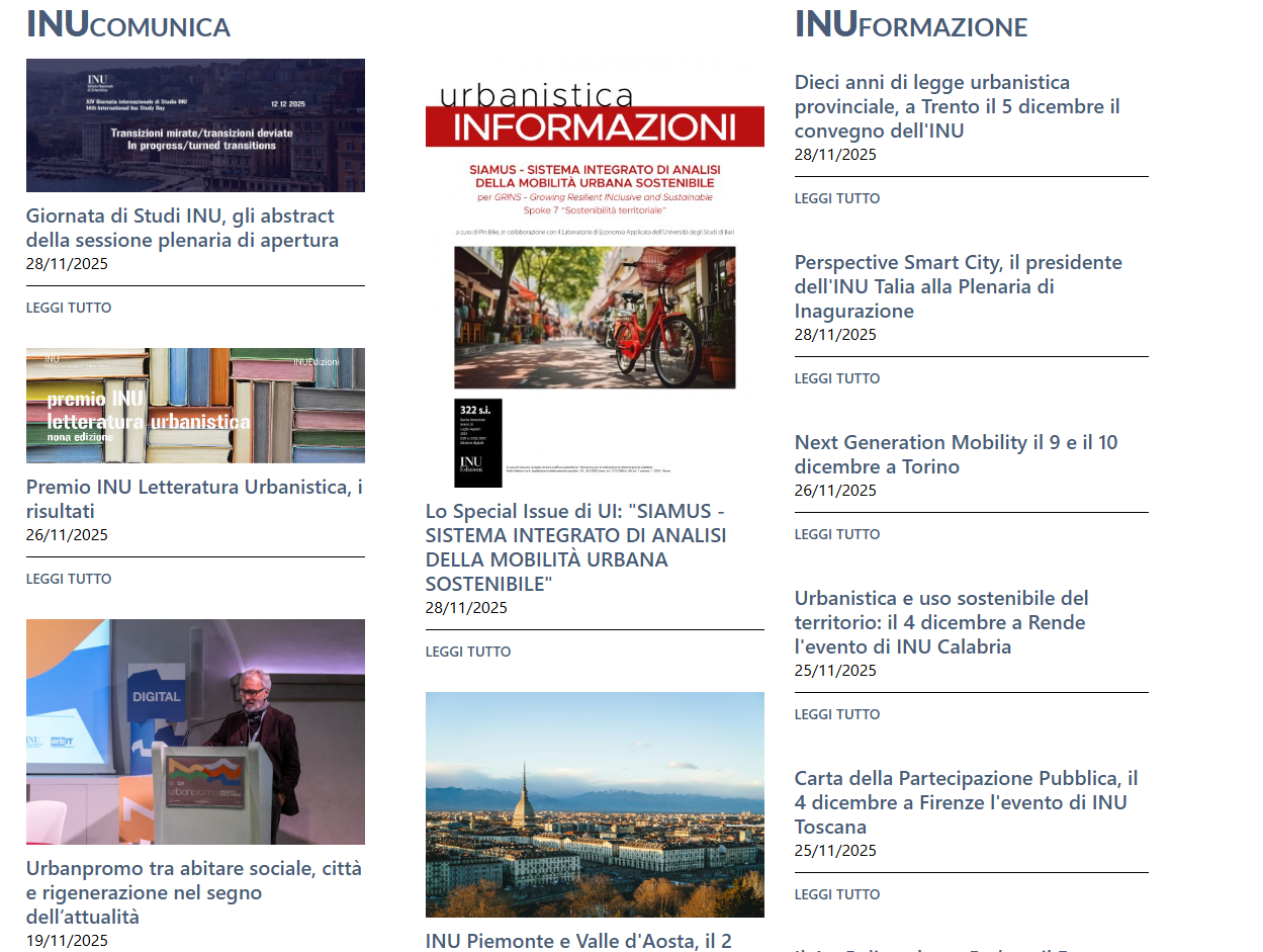 INU 1930년대 이탈리아의 급격한 도시화 과정에서 도시계획의 제도적 기반을 확립하기 위해 설립된 비영리 학술기관으로 (1949 11 21일 대통령령 제1114호로 승인)도시 및 지역 계획의 전문적 연구, 교육, 그리고 정책 자문을 핵심 기능으로 하며, 학계와 공공부문, 실무전문가를 매개하는 플랫폼으로 작동해왔다. 특히 도시공간의 지속가능성과 사회적 형평성을 주요 의제로 제시하며, Urbanistica」 및 「Urbanistica Informazioni」 등 학술지를 통해 이탈리아 도시계획 담론의 중심을 형성해왔다. 유럽 도시계획가협의회 ECTP CEU(European Council of Town Planners)에 가입되어 있는 이탈리아 측 대표 조직 중 하나이며, 1997, 환경부로부터 환경보호협회로도 인정받았다.(1997 7 3일 환경부령 제162)