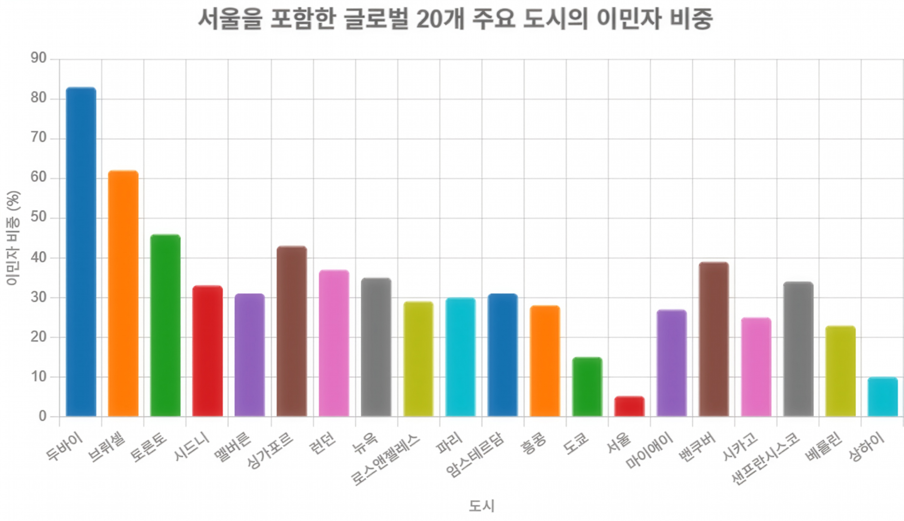 글로벌  20개 주요 도시의 이민자 비중 (2020-2024년 기준)