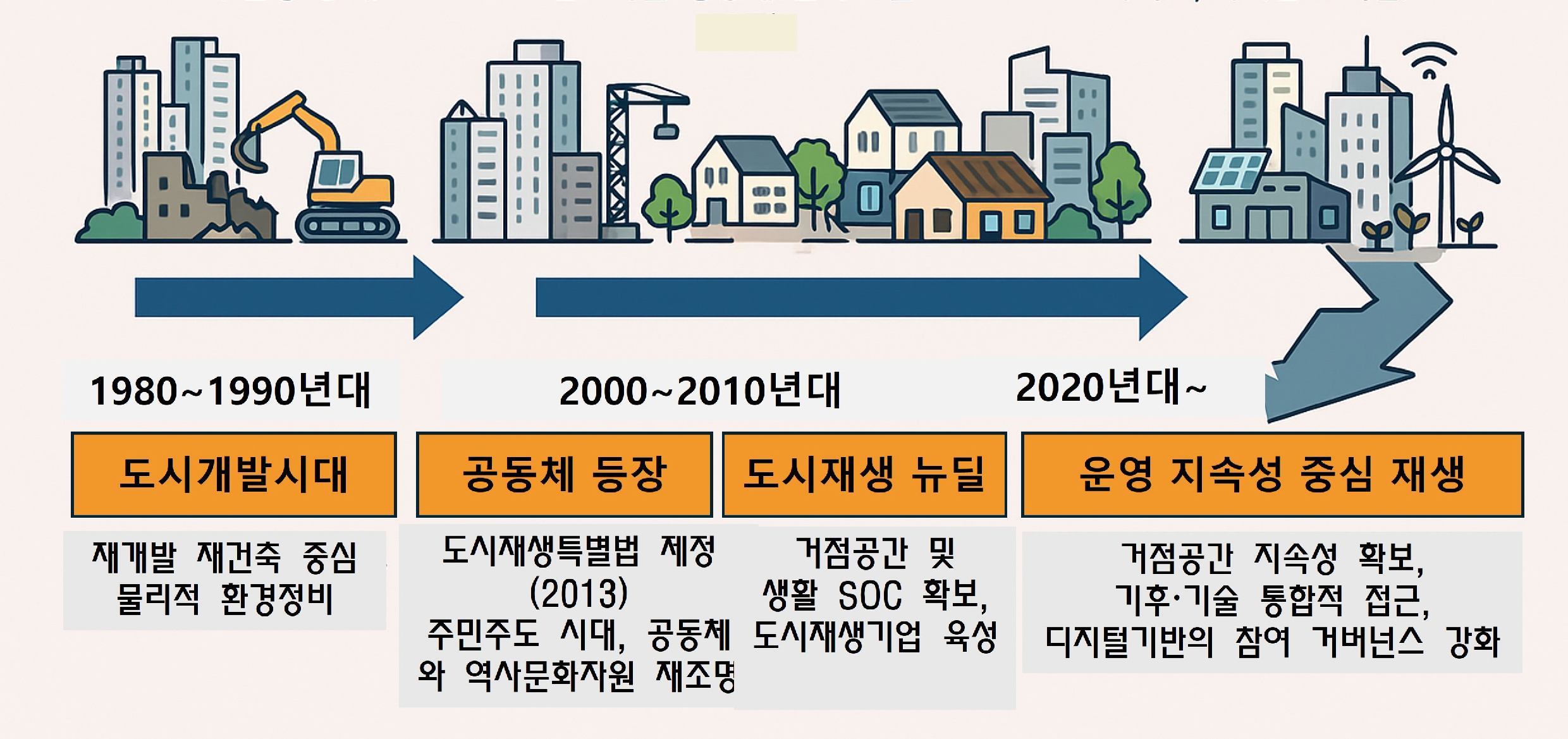 우리나라 도시정책의 패러다임은 20세기말과 21세기 초에 급변하는데 21세기였던 1980~1990년대까지는 성장 중심의 도시개발시대였다면 2000~2010년대에는 공동체와 도시재생이 도시의 주요정책으로 급부상하였다. 그리고 2020년 이후부터 오늘날까지는 지속가능한 운영 중심의 재생으로 변화해 가고 있다. 이 변화는 도시재생이 단순한 도시환경의 물리적 개선에서 출발하여, 오늘날에는 운영, 거버넌스, 기후 대응, 디지털 전환 등 복합적 과제를 아우르는 통합 전략으로 진화해가는 과정이라 할 수 있다.